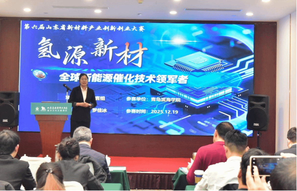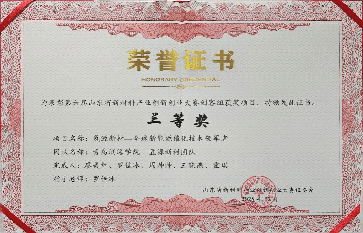 2025年12月19日,由山东省教育厅主办、山东省新材料产业协会承办的第六届山东省新材料产业创新创业大赛决赛在山东济南于良友富临大酒店三楼泉韵厅圆满落幕。本届赛事共吸引了来自全省高校、科研院所和企业的优秀团队参与角逐,竞争激烈。我校机电工程学院氢源新材团队凭借在新能源催化技术方面的创新项目,经过层层选拔成功入围决赛,并在决赛中表现出色,最终荣获创客组三等奖。