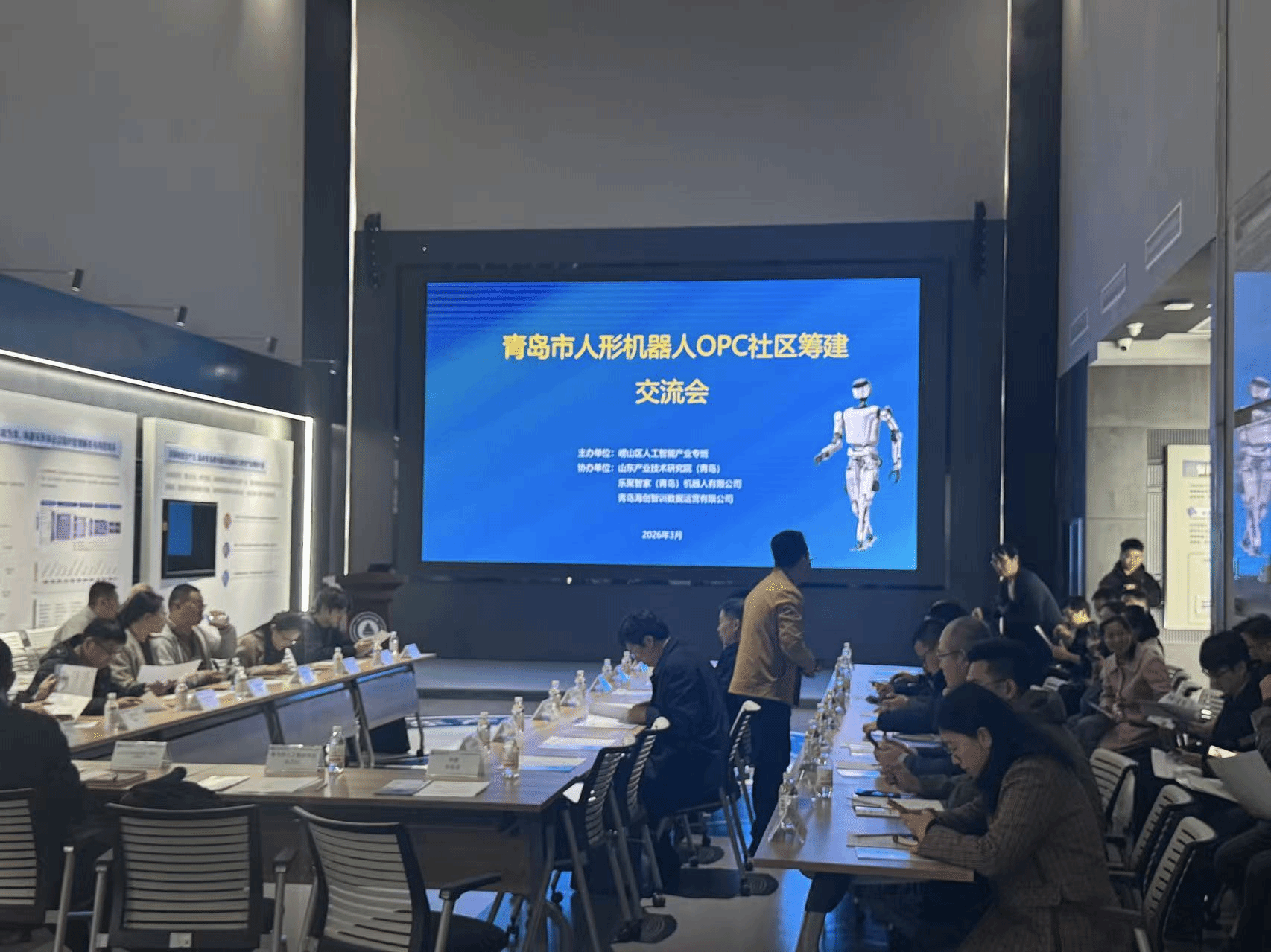 会议重点围绕青岛市人形机器人OPC社区筹建工作展开。相关负责人介绍了人形机器人数据采集训练场及OPC社区空间的建设情况,阐述了平台在功能布局、场景搭建、资源整合与开放共享方面的基本思路,并结合产业发展需求,系统说明了社区筹建的背景、目标定位与推进方向。随后,会议对人形机器人OPC相关产业政策进行了解读,进一步明确了社区在推动科技创新、成果转化、企业孵化和产业集聚中的支撑作用。在专题介绍环节,会议重点说明了OPC社区拟提供的服务内容,涵盖训练场硬件设施、测试场景、研发协作等方面,尤其突出了面向高校团队开放的样机测试、实操实训、项目对接及技术验证等服务功能。乐聚机器人相关负责人还结合具身智能与人形机器人的发展趋势,分享了相关专业建设、课程体系优化及人才培养模式探索的经验,为高校优化学科布局、深化实践教学改革、提升服务区域产业能力提供了有益参考。